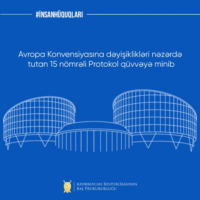 İnsan hüquqları üzrə Avropa Konvensiyasına dəyişiklikləri nəzərdə tutan 15 nömrəli Protokol qüvvəyə minib