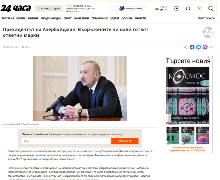 Bolqarıstan mediası Prezident İlham Əliyevin İranın hücumları ilə bağlı çıxışından yazıb