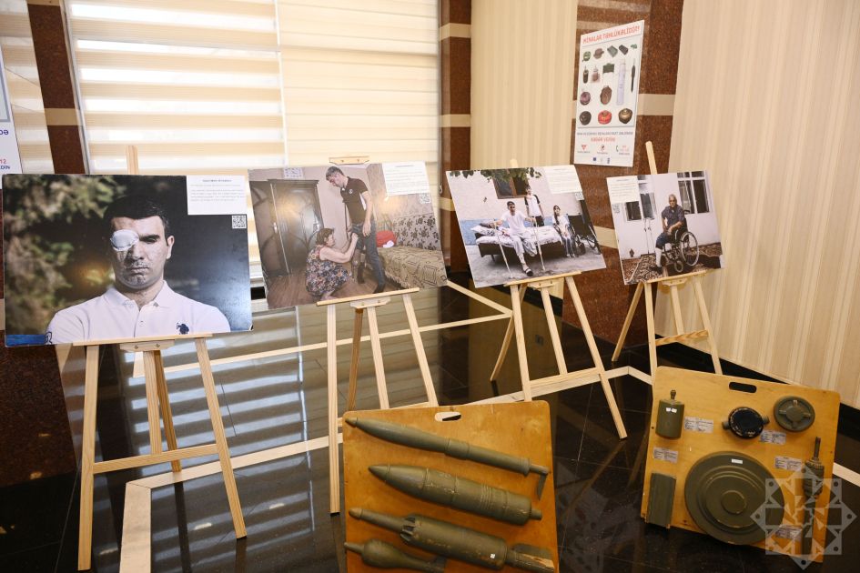Tədbir çərçivəsində mina qurbanlarının fotoları, mina və partlamamış hərbi sursatların maketlərin, posterlərin nümayiş olunduğu sərgi təşkil edilib.
