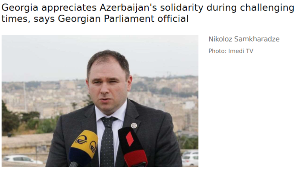 Prezident İlham Əliyevin aprelin 9-da ADA Universitetində “Yeni dünya nizamına doğru" mövzusunda keçirilən beynəlxalq forumdakı çıxışı zamanı söylədiyi “Avropa Komissiyasının Gürcüstanın daxil işləri ilə bağlı proseslərə münasibəti qətiyyən qəbuledilməzdir. Bu, müstəmləkəçilərin davranışıdır. Onlar gürcü xalqının iradəsinə özlərinin müstəmləkəçi keçmişinin prizmasından yanaşırlar. Bu, tamamilə qəbuledilməzdir.... Gürcüstanın bütün daxili işləri Brüsseldəki bürokratlar deyil, gürcü xalqı tərəfindən həll edilməlidir”, - fikrlərini təkrarlayan komitə sədri deyib: “Biz, ilk növbədə, Azərbaycan hökumətinə və xalqına Gürcüstanı ən çətin anlarda belə, dəstəklədiyinə görə təşəkkür etməliyik. Prezident İlham Əliyevin bəyanatı bir daha təsdiqləyir ki, dünya Gürcüstanda gedən prosesləri adekvat şəkildə qəbul edir”.