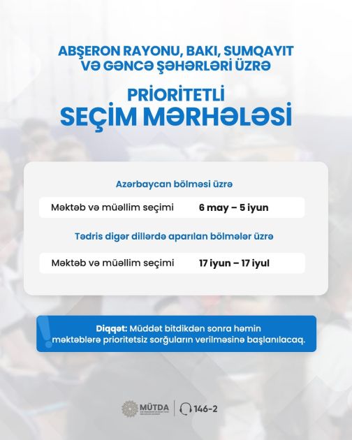 Mayın 1-də 2025–2026-cı tədris ili üzrə ümumi təhsil müəssisələrinin birinci siniflərinə şagird qəbuluna start verilir. Qəbul prosesi www.mektebeqebul.edu.az portalı vasitəsilə aparılacaq.