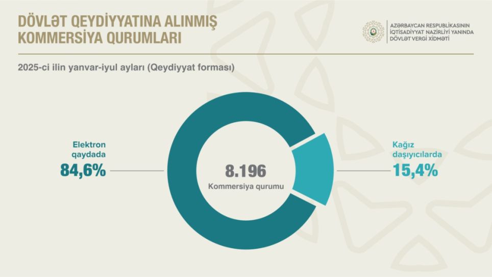 2025-ci ilin yanvar – iyul aylarında 8196 kommersiya qurumu dövlət qeydiyyatından keçib ki, bunun da 88,5 faizi yerli investisiyalı, 11,5 faizi isə xarici investisiyalıdır. Dövlət qeydiyyatında olan kommersiya hüquqi şəxslərin 91,8 faizi məhdud məsuliyyətli cəmiyyət, 1,1 faizi səhmdar cəmiyyət, 1,1 faizi kooperativ və s. formalarda yaradılıb.