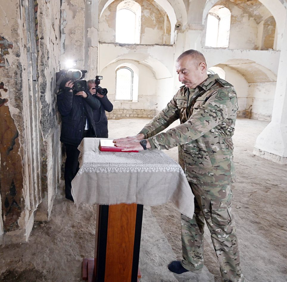 Biz müharibə dövründə də özümüzü ləyaqətlə aparmışıq və müharibənin bütün qaydalarına riayət etmişik. Məhz buna görə Ermənistan tərəfində mülki vətəndaşlar arasında itkilər həddindən artıq azdır. Biz ancaq işğalçı orduya qarşı mübarizə aparmışıq, müharibə aparmışıq. Dinc əhaliyə qarşı heç vaxt müharibə aparmamışıq. Ermənilərdən fərqli olaraq, soyqırımı törətməmişik və digər hərbi cinayətlər törətməmişik. Ancaq ermənilərin törətdikləri cinayətlər artıq bütün dünyaya bəllidir: Xocalı soyqırımı, digər kəndlərimizin sakinlərinin qətlə yetirilməsi, şəhərlərimizin dağıdılması. Baxın, görün, Ağdam şəhəri yoxdur, yoxdur. Bir bina da yoxdur. Bir Cümə məscidinin qalıqları qalıb. Onu da mən demişəm, onlar iki məqsəd üçün saxlamışdılar. Bir məqsəd o torpağa bağlı olan bir işarə idi. Yəni artilleriya atəşinin tənzimlənməsi üçün lazım idi bu məntəqə, bu obyekt. İkinci məqsəd müşahidə məntəqəsi idi. Məscidin minarələrindən onlar müşahidə edirdilər. İndi mən müharibədən sonra Ağdama ikinci dəfə səfər edirəm. Birinci dəfə Ağcabədi istiqamətindən gəldim. Bu dəfə isə Bərdə istiqamətindən gəldim. Hər iki istiqamət üzrə bir neçə müdafiə xətti var, istehkamlar var. Cümə məscidinin qalıqlarından başqa, bir dənə də salamat bina yoxdur. Bunu hansısa yadplanetli, necə deyərlər, ünsürlər törətməyiblər. Bunu bizim qonşumuz olan, bizim çörəyimizi yeyən, bizim torpağımızda özünə yuva salan, ancaq bizə qarşı daim nifrət hissi ilə yaşayan ermənilər törədiblər. Bu dağıntılar Birinci Qarabağ müharibəsindən sonra törədildi. Bu, ikinci müharibə dövründə törədilən dağıntılar deyil. Bizim bütün maddi sərvətimiz məqsədyönlü şəkildə dağıdıldı, talan edildi. Tarixi-dini abidələrimiz söküldü. Bunun da bir neçə məqsədi var idi. Birincisi, bizə olan nifrət. İkincisi, Azərbaycan xalqının mədəni irsini bu torpaqlardan silmək məqsədi və əlbəttə ki, gələcəkdə elə bir vəziyyət yaratmaq ki, Azərbaycan əhalisi bu torpaqlara qayıda bilməsin.