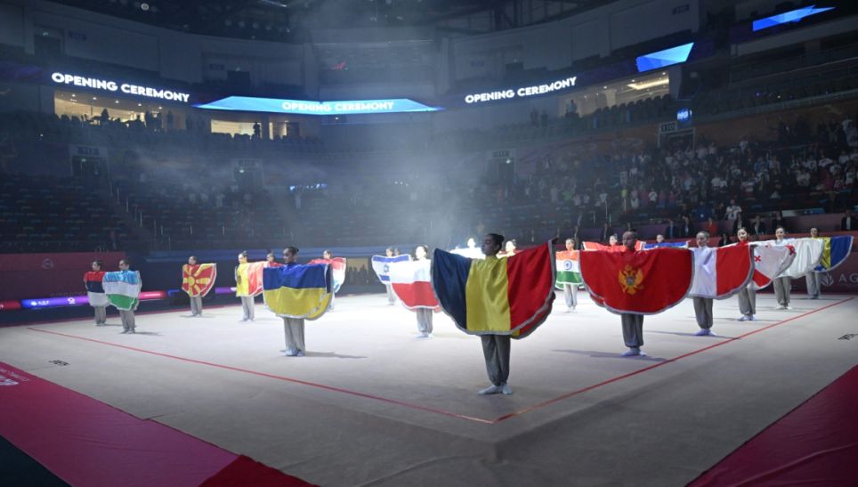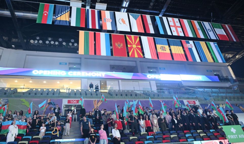 AZƏRTAC xəbər verir ki, Milli Gimnastika Arenasında təşkil edilən tədbirdə əvvəlcə iştirakçı ölkələr təqdim olunub, dövlət bayraqları zala gətirilib.