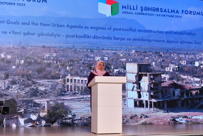 Cənab Prezident, Ağdamda keçirilən birinci Azərbaycan Milli Şəhərsalma Forumuna dəvətiniz məni çox məmnun etdi. Bu konfrans zalı, Füzuli Hava Limanı və tikinti layihələri Sizin hökumətinizin postmünaqişə ərazisində şəhərlərin bərpası istiqamətində səylər göstərmək əzmini və fədakarlığını nümayiş etdirir. Siz vətəndaşlarınız üçün daha yaxşı gələcək qurursunuz. Təbrik edirəm. BMT-nin Baş katibi cənab Antonio Quterreşin dediyi kimi, müharibə və münaqişələrdə qaliblər olmur, yalnız məğlublar olur. 2022-ci il BMT Məskunlaşma Proqramının Dünya Şəhərləri hesabatına əsasən, münaqişələr səbəbindən 70 milyondan çox insan yoxsulluq həddindən aşağı səviyyədə yaşayır. Təkcə 2021-ci ildə 84 milyon insan zorakılıq, təhlükə və iqlim dəyişikliyinin təsiri səbəbindən evlərindən didərgin düşüb. Məsələn, ərəb regionunda 26 milyon qaçqının əksəriyyəti şəhərlərdə cəmləşib. Pakistanda son vaxtlar güclü daşqınlar 33 milyon insanı evlərindən didərgin salıb. BMT-nin Məskunlaşma Proqramında bizim üçün inkişafın əsas amili sülh və sabitlikdir. Məhz bu səbəbdən, bizim İcraiyyə Komitəsi 2022-ci ilin martında keçirilən iclasında məndən postmünaqişə və fəlakətdən sonrakı urban dayanıqlılıq üzrə fəaliyyətimizi genişləndirməyi xahiş edib. BMT-nin Məskunlaşma Proqramı lazımi yaşayış və vacib infrastruktur təmin etməklə Suriya, İraq, Livan, İordaniya, Fələstin, Sudan və Yəməndə məcburi köçkün və qaçqınları dəstəkləyir. Biz, həmçinin ictimai məkanları reabilitasiya edirik, torpaq mülkiyyətçiliyinə və mülkiyyət hüquqlarına şərait yaradaraq onları bərpa edirik.