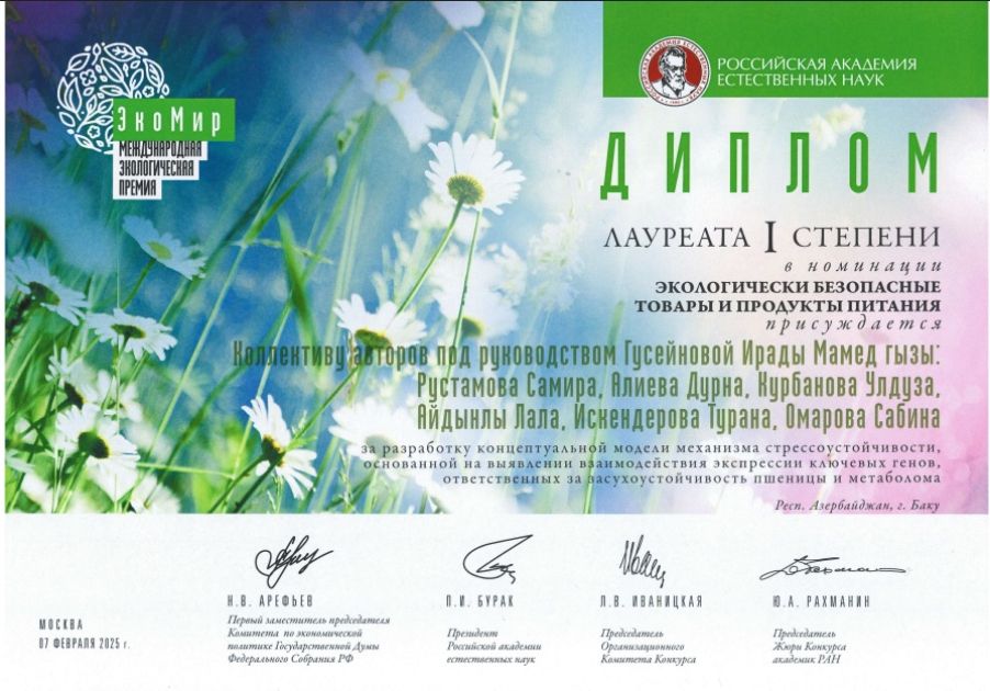 Rusiya Təbiət Elmləri Akademiyası (RTEA) tərəfindən “EkoMir - 2024” beynəlxalq ekologiya mükafatına layiq görülən AMEA-nın vitse-prezidenti, Elm və Təhsil Nazirliyinin Molekulyar Biologiya və Biotexnologiya İnstitutunun direktoru akademik İradə Hüseynovaya mükafatı təqdim olunub.