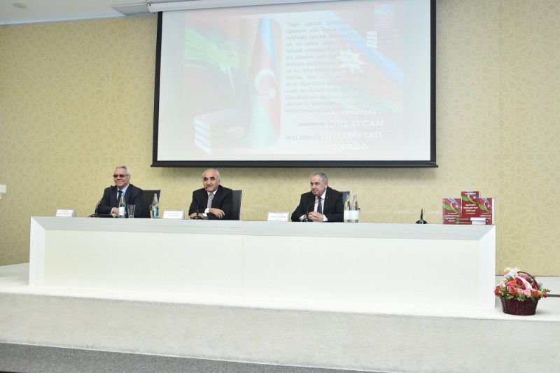 AZƏRTAC xəbər verir ki, tədbirə moderatorluq edən UNEC-in rektoru professor Ədalət Muradov “Azərbaycan iqtisadiyyatı 100 ildə" beşcildliyini Azərbaycan iqtisad elmi üçün fundamental, dəyərli mənbə adlandırıb, yeni nəşrin əhəmiyyətindən, özəlliklərindən söz açıb.