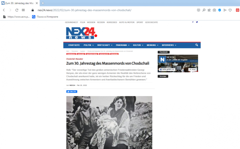 Almaniyanın “nex24.news” və “glamssup.com” portallarında almaniyalı türkoloq alim və Azərbaycan üzrə tədqiqatçı Mixael Raynhard Hesin müəllifliyi ilə “Xocalı soyqırımının 30-cu ildönümünə ithafla” sərlövhəli məqalələr dərc olunub.