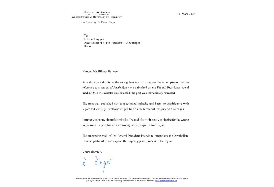 Almaniya Prezidenti Administrasiyası bu ölkənin Prezidentinin sosial media profilində yerləşdirilmiş postla bağlı Azərbaycan tərəfinə üzrxahlıq edib