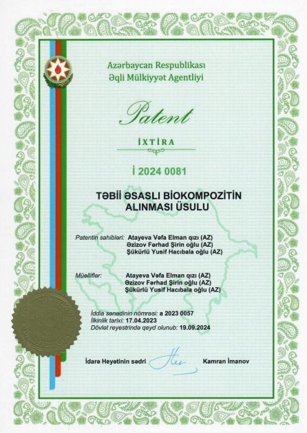 Mərkəzdən AZƏRTAC-a bildirilib ki, əməkdaşlara “Təbii əsaslı biokompozitin alınması” adlı ixtiraya görə Azərbaycan Respublikası Əqli Mülkiyyət Agentliyi tərəfindən patent verilib.