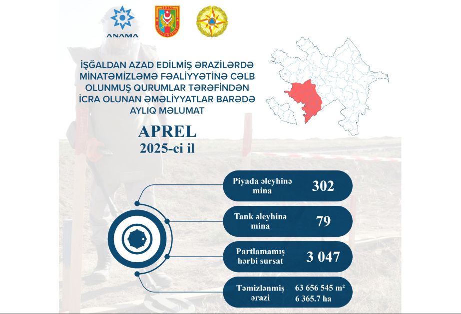 Azərbaycan Respublikasının Minatəmizləmə Agentliyi (ANAMA) işğaldan azad edilmiş ərazilərdə minatəmizləmə fəaliyyətinə cəlb olunmuş qurumlar tərəfindən apreldə icra edilən minatəmizləmə əməliyyatlarına dair aylıq məlumatı açıqlayıb.