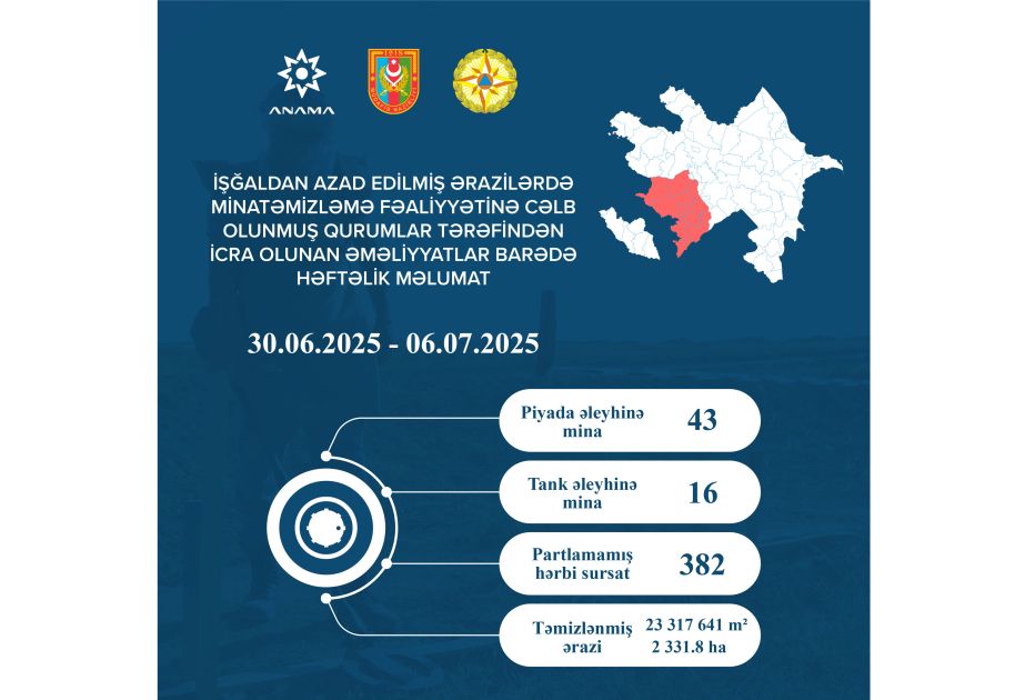 Azərbaycan Respublikasının Minatəmizləmə Agentliyi (ANAMA) işğaldan azad edilmiş ərazilərdə minatəmizləmə fəaliyyətinə cəlb olunmuş qurumlar tərəfindən 30 iyun-6 iyul tarixlərində icra edilən minatəmizləmə əməliyyatlarına dair məlumatı açıqlayıb.