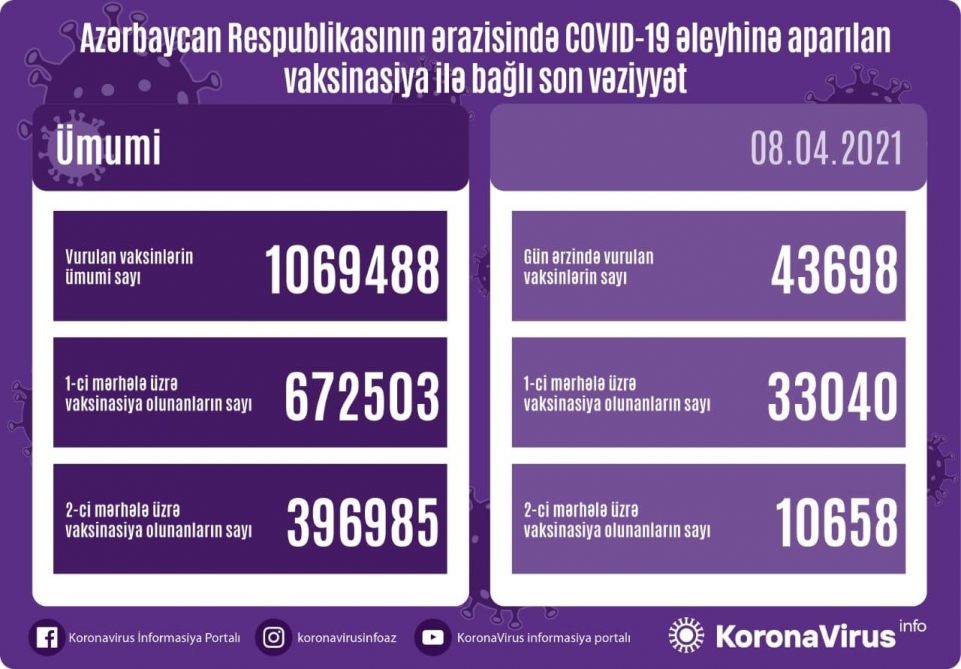 Hazırkı dövrədək ölkəmizdə vurulan vaksinlərin sayı 1 milyon 69 min 488-ə bərabərdir. Birinci mərhələ üzrə vaksin vurduranların sayı 672 min 503, ikinci mərhələ üzrə peyvənd olunanların sayı 396 min 985 nəfərdir.