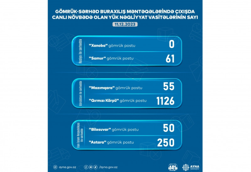 AYNA-dan AZƏRTAC-a bildirilib ki, gömrük-sərhəd məntəqələrində çıxışda gözləmədə olan nəqliyyat vasitələrinin sayı barədə məlumata əsasən, “Astara” gömrük postunda 250, “Biləsuvar” gömrük postunda 50, “Qırmızı Körpü” gömrük postunda 1126, “Mazımqara” gömrük postunda 55, “Samur” gömrük postunda 61 yük maşını var. “Xanoba” gömrük postunda isə növbə yoxdur.