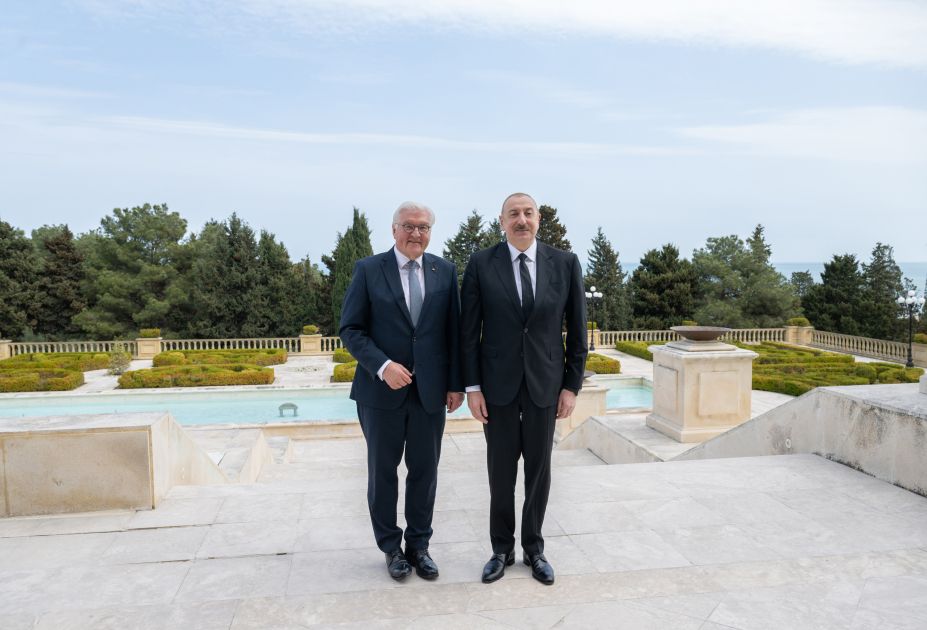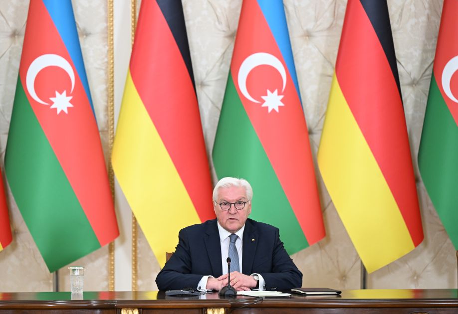 -Hörmətli həmkarım cənab Prezident, bu səmimi dəvətə görə ürəkdən çox təşəkkür edirəm və qonaqpərvərliyə görə bütün alman nümayəndə heyətinin adından təşəkkür edirəm. Biz burada bundan çox zövq alırıq. Siz dediniz ki, Azərbaycanda birinci dəfə deyiləm, bu funksiyada ilk dəfəyəm. Prezident kimi birinci dəfə gəlirəm. Əvvəllər Azərbaycanda dəfələrlə olmuşam. Amma axırıncı dəfə 2016-cı ildə olub, doqquz il keçib üstündən. İndi dünyada vəziyyət elə tez dəyişir, geosiyasi baxımdan 9 ildə o qədər dəyişikliklər olub ki, 2016-cı ildə buraya səfərim mənə artıq uzaq keçmiş kimi görünür. Ona görə şadam ki, bu gün yenidən gəlib görüşdük və çox geniş fikir mübadiləsi apara bildik. Biz həmişə bu mübadiləni aparmışıq. Bakıda olmasa da, başqa yerlərdə görüşmüşük, telefonla söhbət etmişik. Bu aralarda Münxen Təhlükəsizlik Konfransında görüşmüşük, eləcə də Sizin Berlinə səfərinizi yaxşı xatırlayıram. Keçən il baş tutan bu görüşdə müzakirə aparmışıq və şadam ki, mən indi Sizin səfərinizin qarşılığı olaraq ölkənizdə səfərdəyəm.