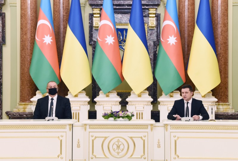 Yanvarın 14-də Ukraynada işgüzar səfərdə olan Azərbaycan Respublikasının Prezidenti İlham Əliyev və Ukrayna Prezidenti Volodimir Zelenski sənədlərin imzalanması mərasimindən sonra mətbuata bəyanatlarla çıxış ediblər.