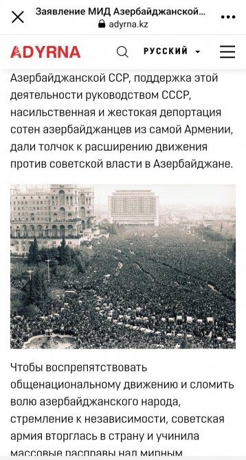 AZƏRTAC xəbər verir ki, məqalədə 1990-cı il yanvarın 19-dan 20-ə keçən gecə SSRİ rəhbərliyinin əmri ilə sovet ordusunun Azərbaycanın Bakı, Sumqayıt və digər şəhərlərinə yeridildiyi qeyd edilib. Bu hərbi müdaxilə nəticəsində 147 mülki şəxs qətlə yetirilib və 744 nəfər ağır xəsarət alıb. Bu hadisə müasir Azərbaycan tarixinə “Qara Yanvar” kimi daxil olub.