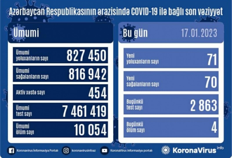 Son sutkada yeni yoluxma hallarının müəyyənləşdirilməsi ilə əlaqədar 2 min 863, bu günə qədər isə ümumilikdə 7 milyon 461 min 419 test icra olunub.