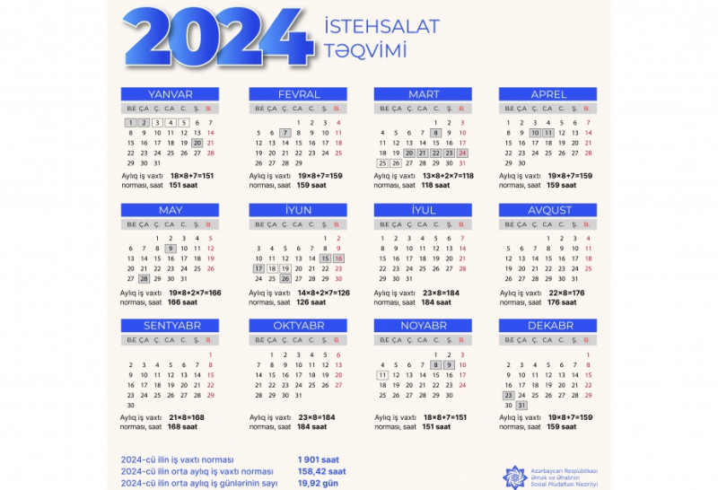 2024-cü ilin iş vaxtı norması 40 saatlıq beşgünlük iş həftəsi üzrə 8 saatlıq iş günü hesabından müəyyən edilir və bu zaman iş günü hesab edilməyən bayramqabağı, səsvermə, habelə Ümumxalq hüzn günü qabağı iş günlərində həftəlik iş günlərinin müddəti bir saat qısaldılır. 2024-cü il üçün 40 saatlıq iş həftəsində iş vaxtının illik norması 1901 saatdır.