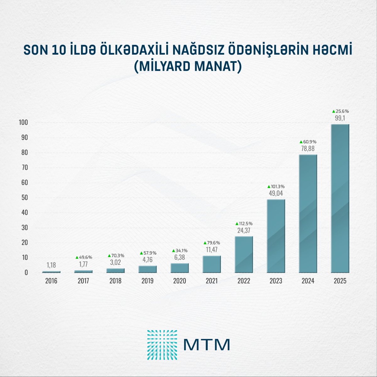 Media Təhlil Mərkəzinin (MTM) Azərbaycan Mərkəzi Bankının açıqladığı rəsmi statistik göstəricilər əsasında apardığı təhlilə görə, 2025-ci ildə ölkə daxilində nağdsız ödənişlərin həcmi 99,1 milyard manat təşkil edib. Bu göstərici 2024-cü illə müqayisədə 25,6 faiz və ya 20,22 milyard manat artım deməkdir.