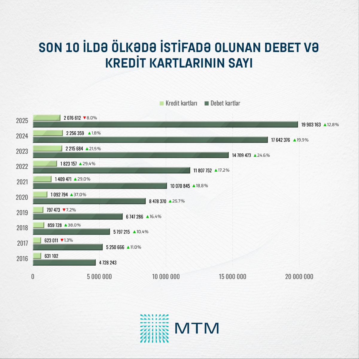Qeyd edildiyi kimi, 2025-ci ilin sonuna ölkə üzrə istifadədə olan plastik kartların ümumi sayı 21 milyon 979 min 775 ədəd təşkil edib. Bu kartların 19 milyon 903 min 163 ədədi debet, 2 milyon 76 min 612 ədədi isə kredit kartları olub.