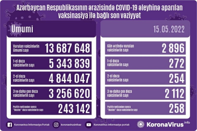 Qeyd edək ki, ölkədə bu günə qədər vurulan vaksinlərin ümumi sayı 13 milyon 687 min 648, birinci doza peyvəndlərin ümumi sayı 5 milyon 343 min 839, ikinci doza vaksinlərin sayı 4 milyon 844 min 47 təşkil edib. Üç və daha çox doza vaksinlərin sayı 3 milyon 256 min 620, pozitiv nəticədən sonra “buster” doza vaksinlərin sayı isə 243 min 142 olub.