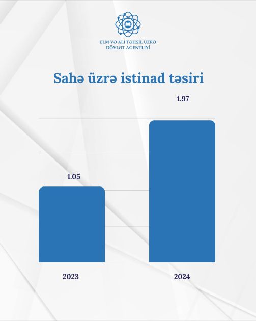 Həmçinin Azərbaycanın sahə üzrə istinad təsiri (Field Weighted Citation Impact – FWCI) 2024-cü ildə dünya üzrə orta həddi (1.0) keçərək 1.97-ə çatıb. Bu isə dərc olunan bütün elmi işlərin öz sahəsi üzrə ortalama 97 faiz daha çox istinad alması deməkdir. Ötən il bu göstərici 1.05-ə bərabər idi.