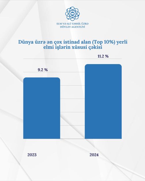 Dərc olunan elmi işlərin keyfiyyəti də artmaqdadır. Belə ki, bu məqalələrin 11.2 faizi dünyanın ən çox istinad edilən 10 faiz elmi işi arasındadır. Ötən il isə bu göstərici 9.2 faizə bərabər idi.
