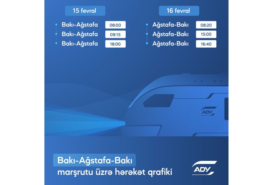 “Azərbaycan Dəmir Yolları” (ADY) QSC Bakı-Ağstafa-Bakı marşrutuna artan sərnişin tələbatını təmin etmək məqsədilə bu xətt üzrə fevralın 15-16-da əlavə qatar reysləri təyin edir.
