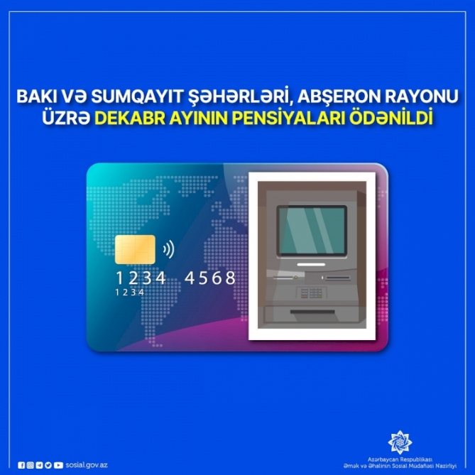 Əmək və Əhalinin Sosial Müdafiəsi Nazirliyinin tabeliyində Dövlət Sosial Müdafiə Fondu tərəfindən Bakı və Sumqayıt şəhərləri, Abşeron rayonu üzrə dekabr ayının pensiyaları ödənilib.