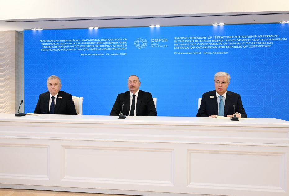 Dünən konfransdakı çıxışımda Azərbaycandan Qara dənizin dibi ilə Avropaya kabel xətti çəkməsi ilə bağlı ölkəmizin artıq həyata keçirilməkdə olan planlarından danışdım. Bu layihənin texniki-iqtisadi əsaslandırılması tamamlanmaq üzrədir və bununla da biz Mərkəzi Asiyanı, Qafqazı, Avropanı, Xəzər və Qara dənizləri vahid enerji dəhlizi ilə birləşdirəcəyik. Xüsusilə sevindirici haldır ki, bu Saziş hər zaman bir-birinə yaxın olan üç qardaş ölkə arasında imzalanır. Özbəkistanla münasibətlərimiz bu il müttəfiqlik münasibətləri səviyyəsinə çatıb, müvafiq saziş imzalanıb. Qazaxıstanla artıq uzun müddətdir ki, strateji tərəfdaş kimi əməkdaşlıq edirik. Qarabağın bərpasında bizə ilk yardım edən ölkələr Özbəkistan və Qazaxıstandır. Füzulidə Mirzə Uluqbəy adına məktəb, Kurmanqazı adına yaradıcılıq mərkəzi bu gün qardaşlığımızın bariz sübutudur. Əminəm ki, biz gələcəkdə də həmişə bir yerdə olacağıq və bir-birimizi dəstəkləyəcəyik. Əziz dostlarım, qardaşlarım Şavkat Miromonoviçə, Kasım-Jomart Kemeleviçə COP29-da iştirak etdiklərinə və öz iştirakları və dəyərli fikirləri, mesajları ilə tədbirimizi zənginləşdirdiklərinə görə minnətdaram.