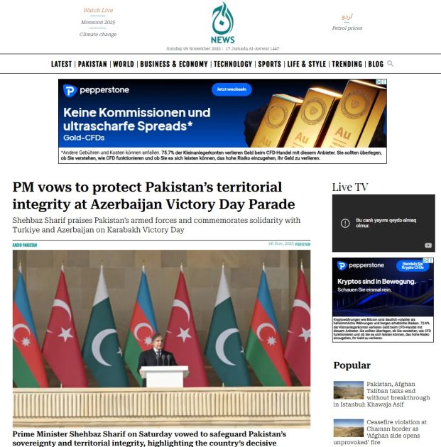 AZƏRTAC xəbər verir ki, yayımlanan xəbərlərdə Azərbaycan Prezidenti İlham Əliyevin, Türkiyə Prezidenti Rəcəb Tayyib Ərdoğanın və Pakistanın Baş naziri Məhəmməd Şahbaz Şərifin çıxışlarında səsləndirdiyi fikirlərə yer verilib, paradın Azərbaycan Ordusunun hərbi qüdrətini tam şəkildə nümayiş etdirdiyi vurğulanıb, həmçinin Vətən müharibəsi barədə məlumat verilib.
