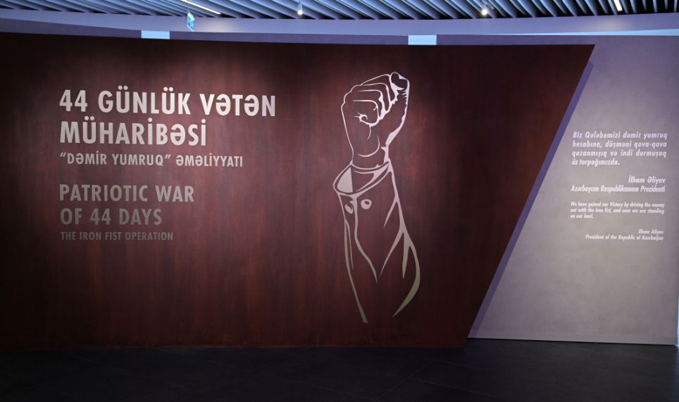 “44 günlük Vətən müharibəsi. “Dəmir yumruq” əməliyyatı” adlı üçüncü zal Azərbaycan torpaqlarının azadlığı uğrunda aparılan qəhrəmanlıq mübarizəsini əks etdirir. Zalın mərkəzindəki LED monitorlar süni intellektlə hazırlanmış videomateriallarla ziyarətçini 44 günlük döyüşlərin mərkəzinə aparır. Monitorlarda döyüş əməliyyatları, hərbi nailiyyətlər və Ermənistan silahlı qüvvələrinin mülki əhaliyə qarşı hərbi hücumları ilə bağlı materiallar təqdim olunur. Holoqrafik ekranlar isə müasir hərbi texnikanı 3D formatda nümayiş etdirir. İnteraktiv xəritələr işğaldan azad edilmiş ərazilərdə həyata keçirilən hərbi əməliyyatların mərhələlərini ardıcıllıqla göstərir. Bu zalda tarixi Qələbənin qazanılmasında müstəsna xidmətləri olan Azərbaycan Respublikasının Silahlı Qüvvələrinin qoşun növlərinin bayraqları, eyni zamanda, Silahlı Qüvvələrin xüsusi təyinatlılarının maketləri var. Həmçinin burada Azərbaycan Prezidentinin Vətən müharibəsi və Zəfərlə bağlı bir sıra fərman və Sərəncamları nümayiş olunur.