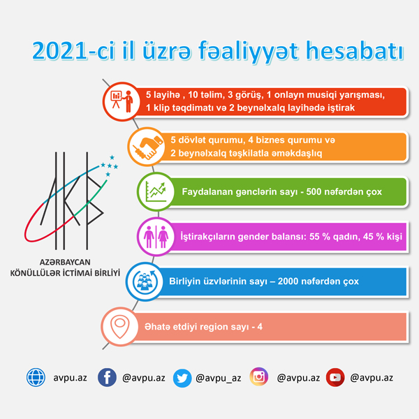 2021-ci ili, ümumilikdə, Azərbaycan Könüllülər İctimai Birliyi üçün uğurlu hesab etmək olar. Ətrafına 2000 gənci toplayan təşkilatımız ötən il ərzində 10 təlim, 5 layihə, 3 görüş, onlayn musiqi yarışması, musiqili klip çəkilişi və klip təqdimatı keçirib. 4 regionu əhatə edən layihələr çərçivəsində 4 dövlət, 4 biznes qurumları və 2 beynəlxalq təşkilatla əməkdaşlıq etmişik. Bu layihələrimizdən birbaşa faydalanan gənclərin sayı isə 500 nəfərdən artıq olub.