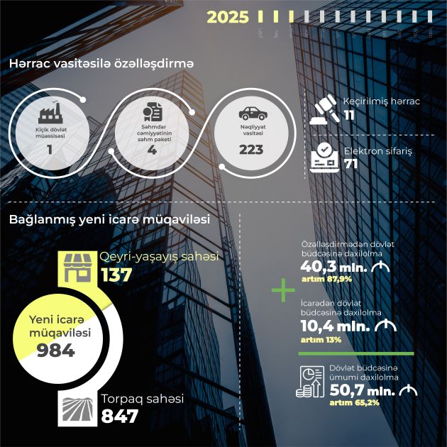 Beləliklə, 2025-ci ilin yanvar-mart ayları ərzində dövlət əmlakının özəlləşdirilməsindən və icarəsindən büdcəyə ümumilikdə 50,7 milyon manat vəsait daxil olub. Bu, ötən ilin eyni dövrü ilə müqayisədə 65,2 faiz çoxdur.