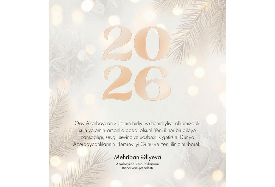 Azərbaycan Respublikasının Birinci vitse-prezidenti Mehriban Əliyeva 31 Dekabr - Dünya Azərbaycanlılarının Həmrəyliyi Günü və Yeni il münasibətilə rəsmi sosial şəbəkə səhifələrində paylaşım edib.