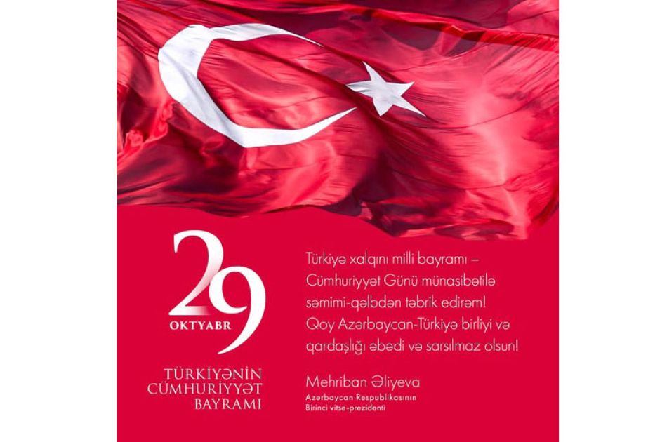 Birinci vitse-prezident Mehriban Əliyeva Türkiyə xalqını milli bayram münasibətilə təbrik edib