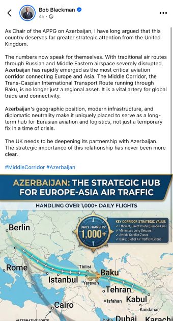 O qeyd edib ki, Azərbaycanın coğrafi mövqeyi, müasir infrastrukturu və diplomatik neytrallığı onu yalnız böhran dövründə müvəqqəti həll yolu kimi deyil, Avrasiya məkanında aviasiya və logistika sahəsində uzunmüddətli mərkəz rolunu oynamaq üçün unikal mövqeyə çevirir.