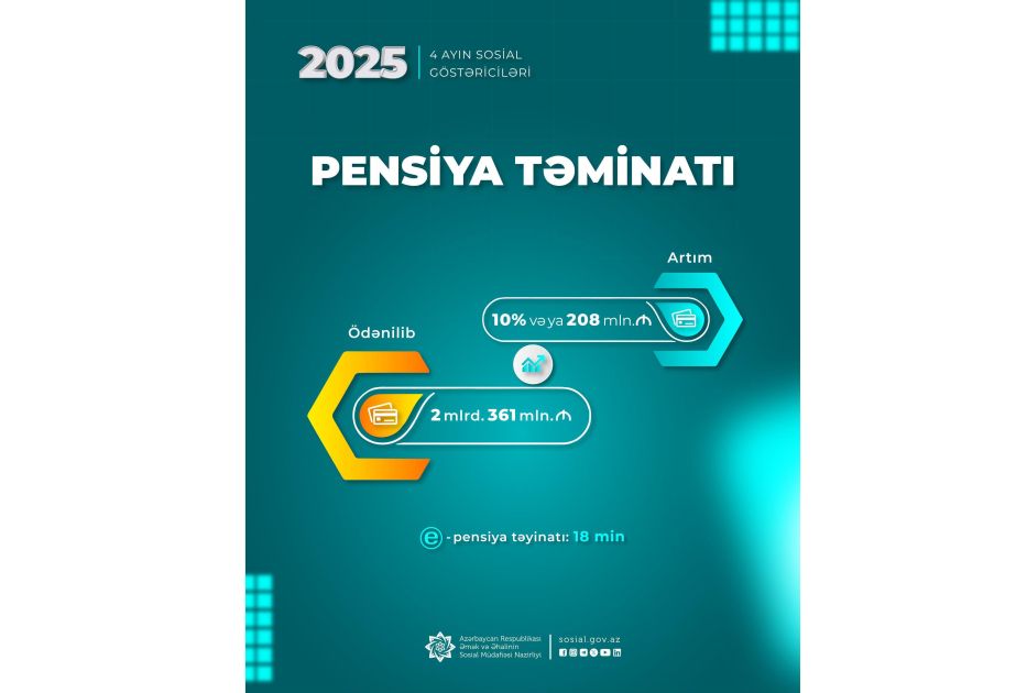Bu ilin dörd ayında pensiya ödənişlərinə ötən ilin müvafiq dövrünə nisbətən 10 faiz (208 milyon manat) çox olmaqla 2 milyard 361 milyon manat vəsait yönəldilib.