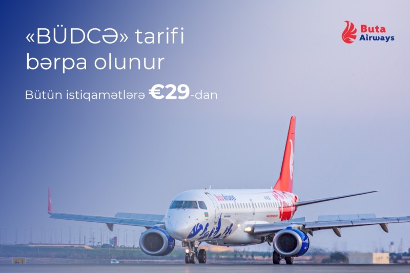 Azərbaycanın aşağıbüdcəli aviadaşıyıcısı olan “Buta Airways” aviaşirkəti qiyməti 29 avrodan başlayan “Büdcə” tarifi ilə aviabilet əldə etmək imkanını bərpa edib.