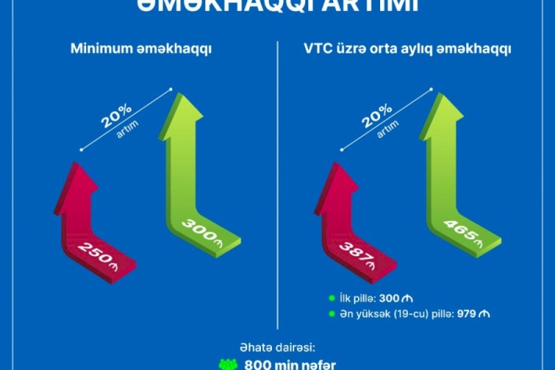 VTC üzrə işçilərdə orta aylıq əməkhaqqı 387 manatdan 465 manata çatıb. Hazırda həmin cədvəlin ilk pilləsi üzrə əməkhaqqı 300 manat, ən yüksək - 19-cu pilləsi üzrə isə 979 manatdır.