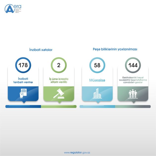Həmçinin elektrik qurğularının texniki istismarı, təhlükəsizlik texnikası qaydalarına əməl olunması və elektrik enerjisindən istifadənin vəziyyətinin araşdırılması məqsədilə 273 nəzarət tədbiri keçirilib. İstilik qurğularının texniki istismarı, təhlükəsizlik texnikası qaydalarına əməl olunması və istilik enerjisindən istifadənin vəziyyətinin araşdırılması məqsədilə 6 nəzarət tədbiri keçirilib. Qazdan səmərəli istifadənin, “Qazdan istifadə Qaydaları”nın və qaz qurğularının etibarlı istismarının, həmçinin digər normativ-hüquqi aktların tələblərinə əməl olunmasının vəziyyətinin araşdırılması məqsədilə 224 nəzarət tədbiri keçirilib.
