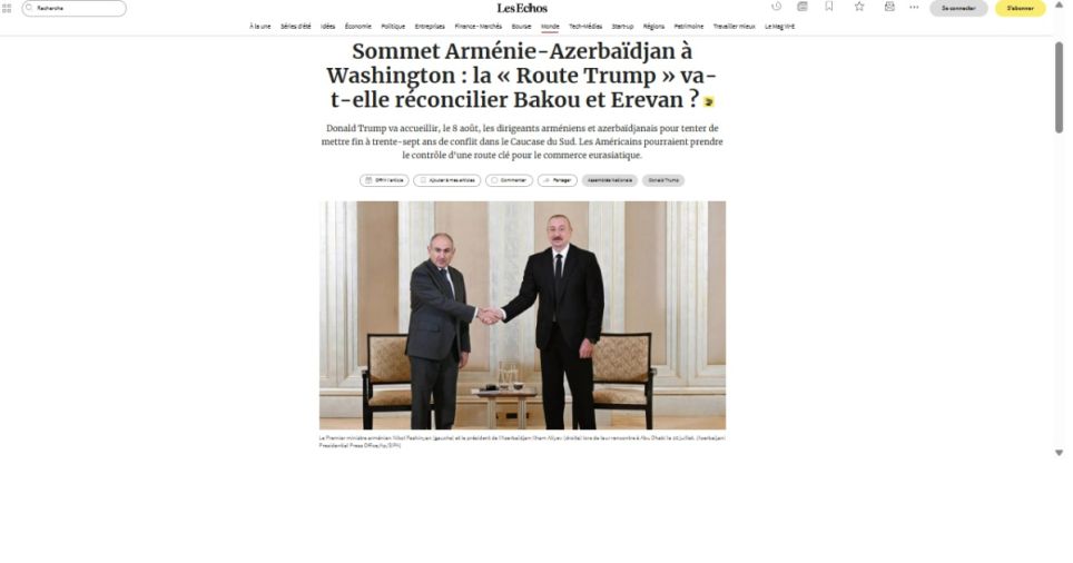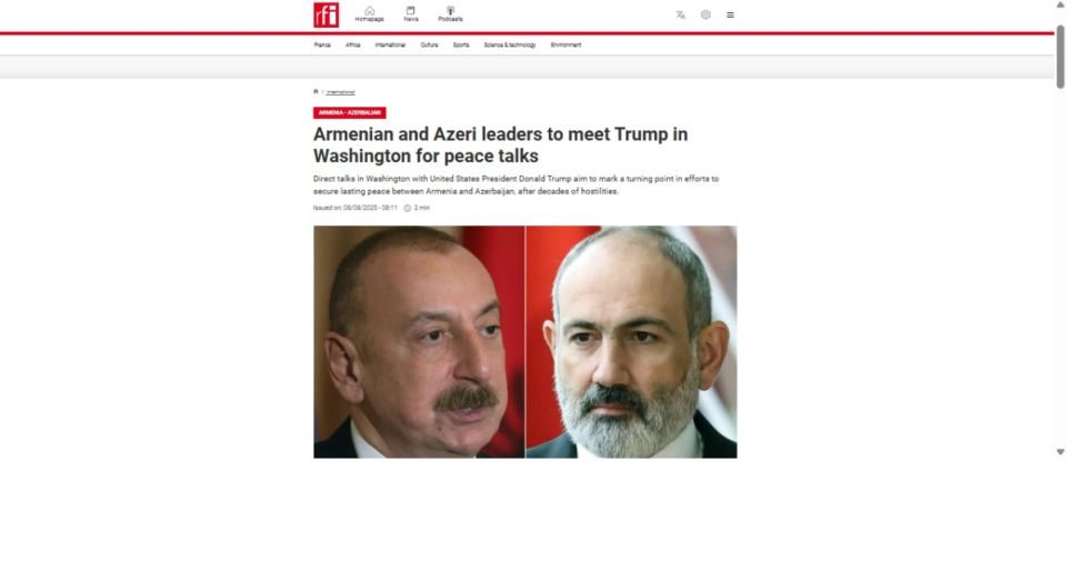 AZƏRTAC xəbər verir ki, fransız mətbuatı bu görüşün məqsədinin Azərbaycan və Ermənistan arasında onilliklərdir davam edən münaqişəyə son qoymaq və sülh sazişinə dair yekun razılaşmanı əldə etmək olduğunu yazır. Qeyd edilir ki, ABŞ Prezidenti Donald Tramp avqustun 8-də Vaşinqtonda Prezident İlham Əliyev və Baş nazir Nikol Paşinyanla birlikdə Ağ evdə sülhə dair sənədin imzalanma mərasimi olacağını vurğulayıb. Bu sənəd onilliklərdir davam edən Qarabağ münaqişəsinə son qoymağı hədəfləyir. “Bir çox lider müharibəyə son qoymağa çalışdı, ancaq bunu yalnız TRUMP bacardı”, - deyə D.Trampın sosial şəbəkələrdəki sözlərindən sitat gətirilib.