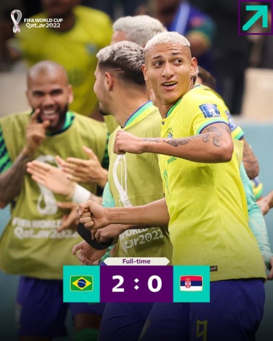 AZƏRTAC xəbər verir ki, G qrupunun ikinci matçında Braziliya millisi Serbiya seçməsi ilə qarşılaşıb. Görüşdə Braziliya komandası rəqibini iki cavabsız qolla məğlub edib. Matçda hər iki qolu Riçarlison vurub. Futbolçu 62-ci və 73-cü dəqiqələrdə fərqlənərək komandası üçün 2:0 hesablı qələbəni təmin edib.