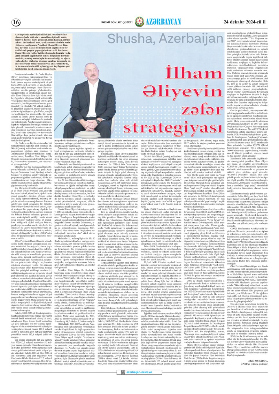 Ölkə Prezidenti İlham Əliyev son illərdə Azərbaycanda milli iqtisadiyyatın inkişafında əldə olunan uğurlara, yaradılan potensiala və bütünlükdə iqtisadi artım amillərinin strukturunda baş verən keyfiyyət dəyişikliklərinə əsaslanaraq 2024-cü il 23 sentyabr tarixində Milli Məclisdəki çıxışında qeyd etmişdir: "İkinci Qarabağ müharibəsi və antiterror əməliyyatı nəticəsində suverenliyimizin tam bərpa edilməsi ölkə qarşısında yeni imkanlar, yeni üfüqlər açır. 30 ilin işğalı arxada qaldı. İndi ölkəmiz genişmiqyaslı quruculuq inkişaf işinə qədəm qoymuşdur və nəticələr də göz qabağındadır".