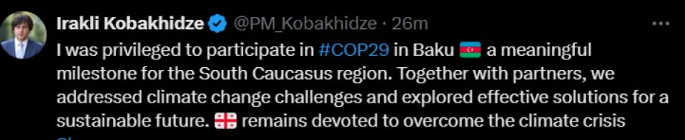 “Bakıda davam edən BMT-nin iqlim dəyişikliyi konfransında iştirak etmək mənim üçün şərəfdir. Bu, Cənubi Qafqaz regionu üçün mühüm hadisədir. Biz tərəfdaşlarımızla birlikdə iqlim dəyişikliyindən yaranan problemləri və davamlı gələcək üçün onların effektiv həlli yollarını müzakirə etdik”, – deyə Baş nazir vurğulayıb.