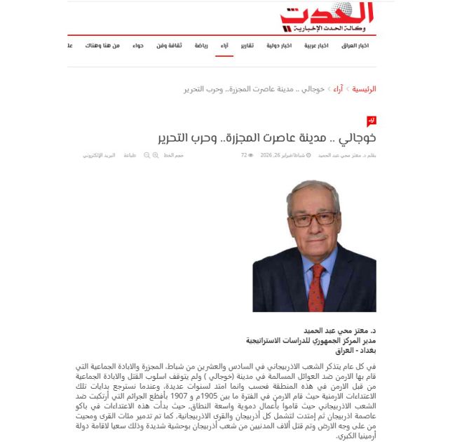 İraqlı tədqiqatçı: Xocalı qətliamı beynəlxalq humanitar hüququn prinsiplərinə qarşı yönəlmiş ağır cinayətdir