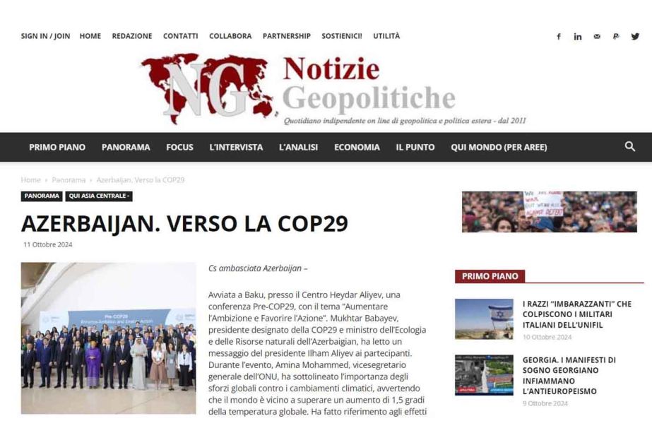 İtaliyanın “Notizie Geopolitiche” nəşrində Azərbaycanın ev sahibliyi edəcəyi BMT-nin İqlim Dəyişikliyi üzrə Çərçivə Konvensiyasının Tərəflər Konfransının 29-cu (COP29) sessiyası barədə məqalə dərc olunub.