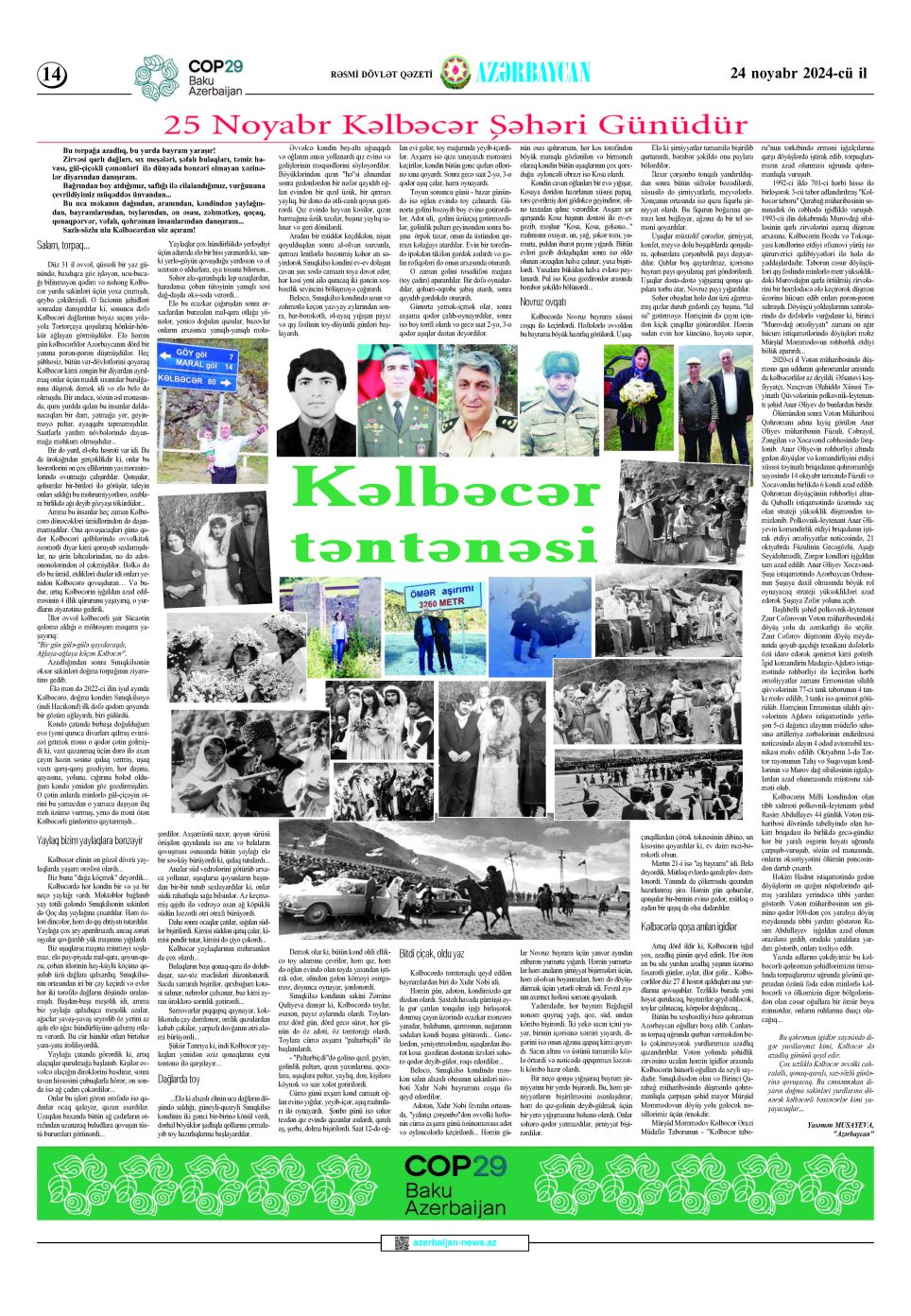 Artıq dörd ildir ki, Kəlbəcərin işğal yox, azadlıq günün qeyd edirik. Hər ötən an bu ulu yurdun azadlıq yaşının üzərinə fəxarətli günlər, aylar, illər gəlir... Kəlbəcərlilər düz 27 il həsrət qaldıqları ana yurdlarına qovuşublar. Tezliklə burada yeni həyat qurulacaq, bayramlar qeyd ediləcək, toylar çalınacaq, körpələr doğulacaq...