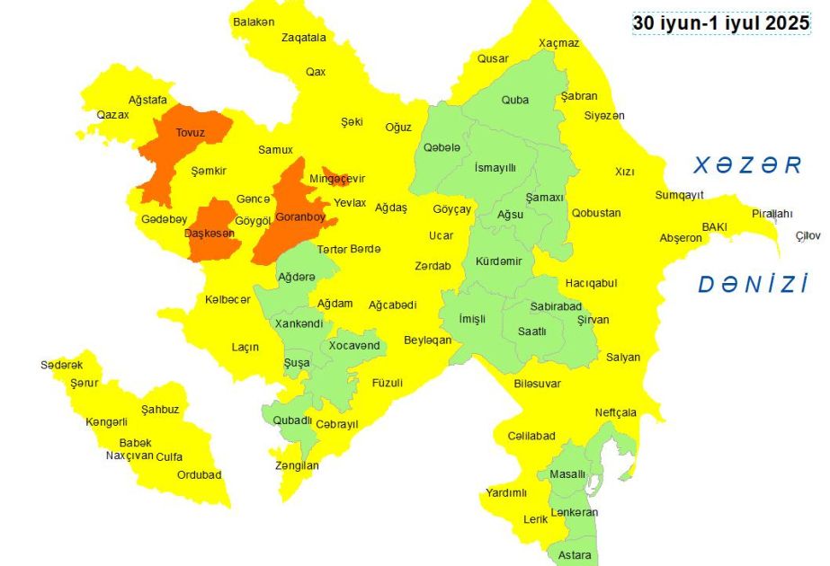 Milli Hidrometeorologiya Xidməti iyunun 30-u və iyulun 1-də Bakıda və Abşeron yarımadasında, eyni zamanda, bəzi bölgələrdə gözlənilən küləkli hava şəraiti ilə bağlı sarı və narıncı xəbərdarlıq verib.